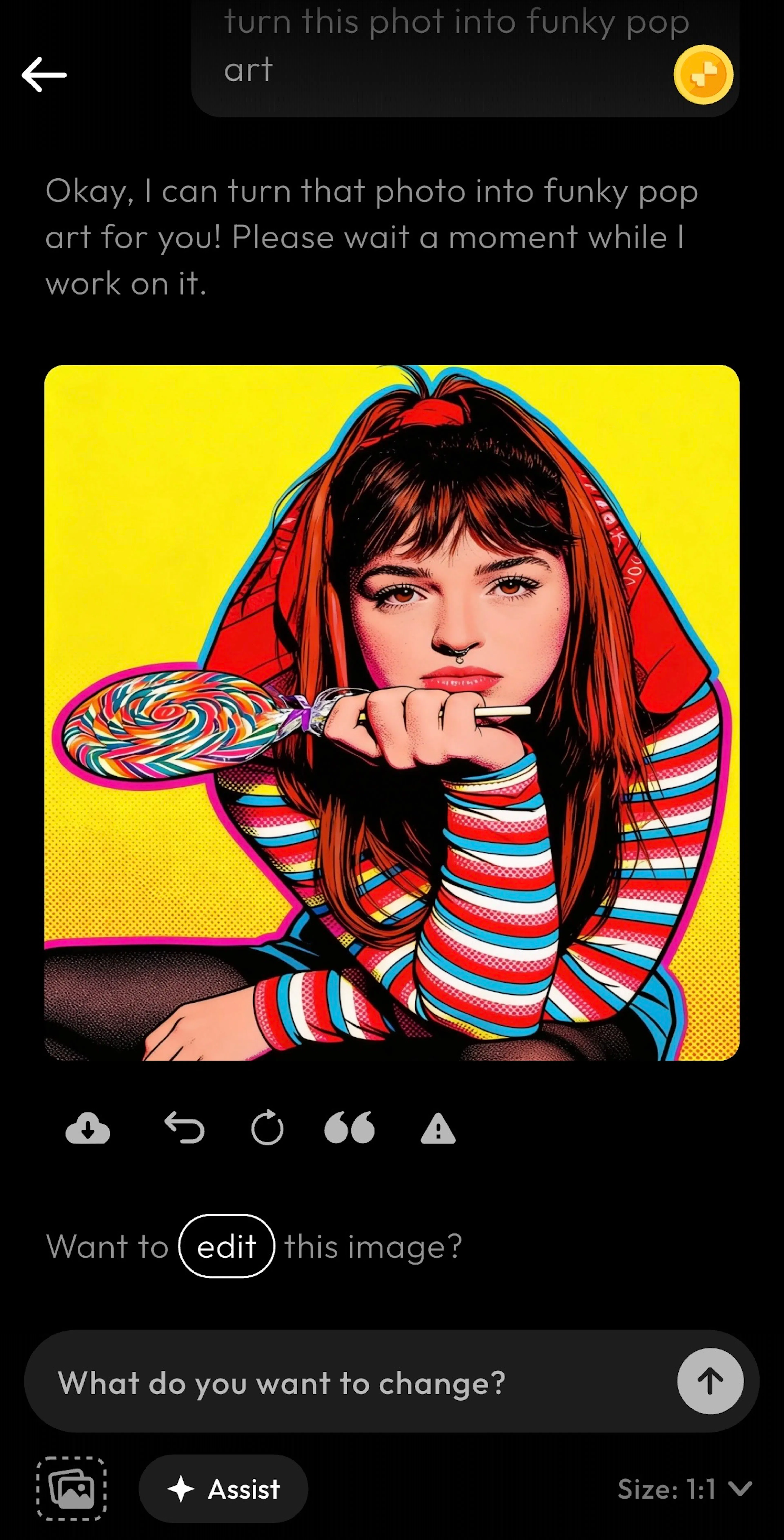 Within seconds, your image transforms with bold outlines, punchy colors, and those classic halftone-style details that define pop art. From here, you can tweak, experiment, or export. But the hard part is over. Blend gives you ready-to-use pop art in seconds.