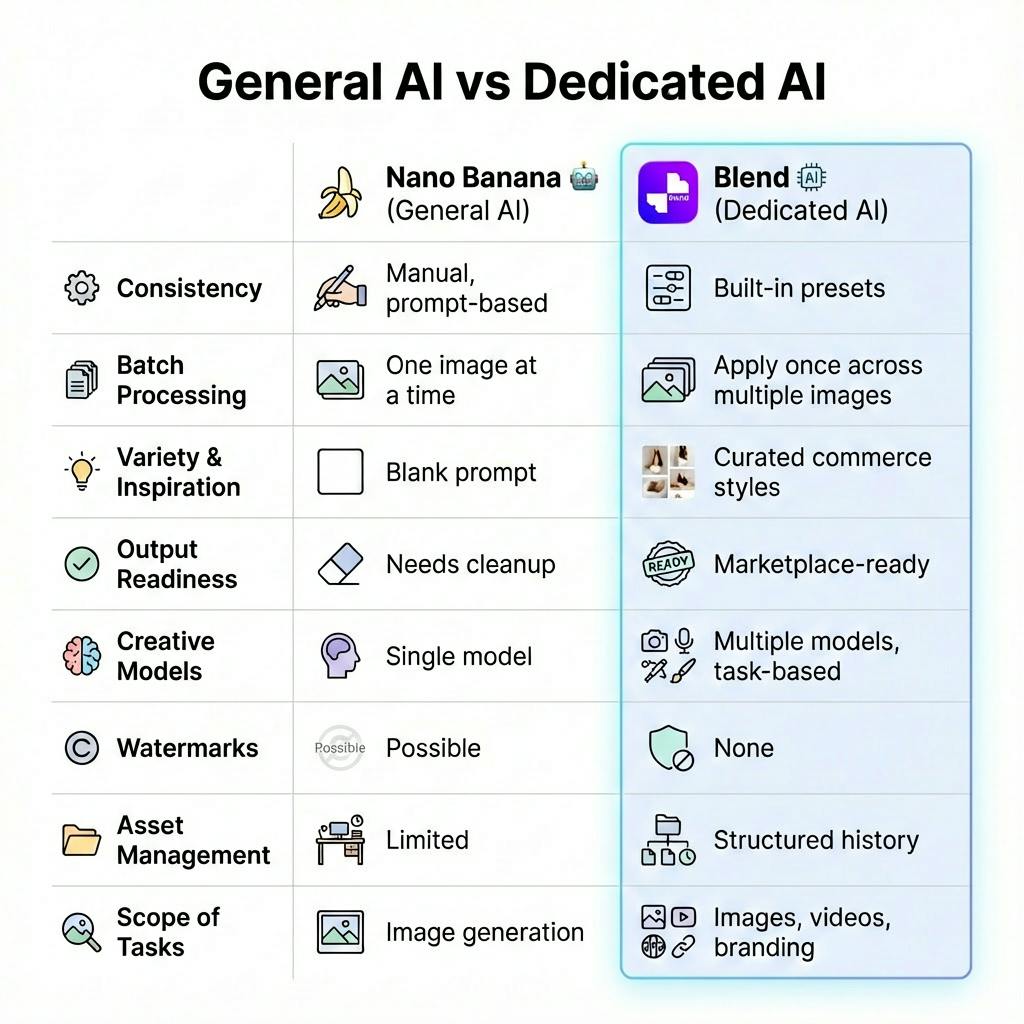 Compare Nano Banana and Blend to understand the difference between general AI tools and dedicated AI software for scalable, commerce-ready visuals.