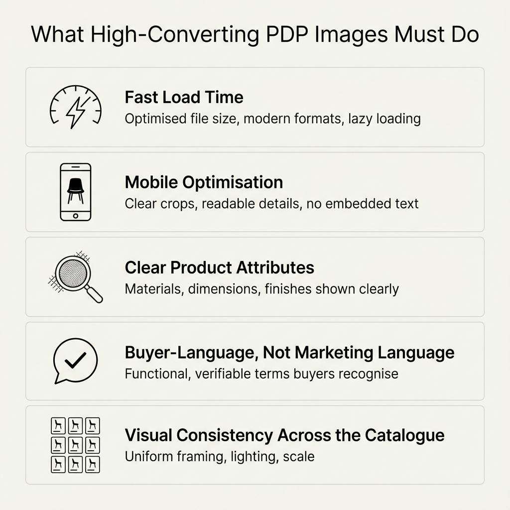 Why Inconsistent PDP Imagery Hurts: Inconsistent PDP imagery erodes trust by making the catalogue feel unreliable, complicates comparison between products, and signals low operational maturity. When images vary widely in presentation, buyers are forced to mentally adjust for differences rather than focus on the product itself, increasing friction and hesitation.