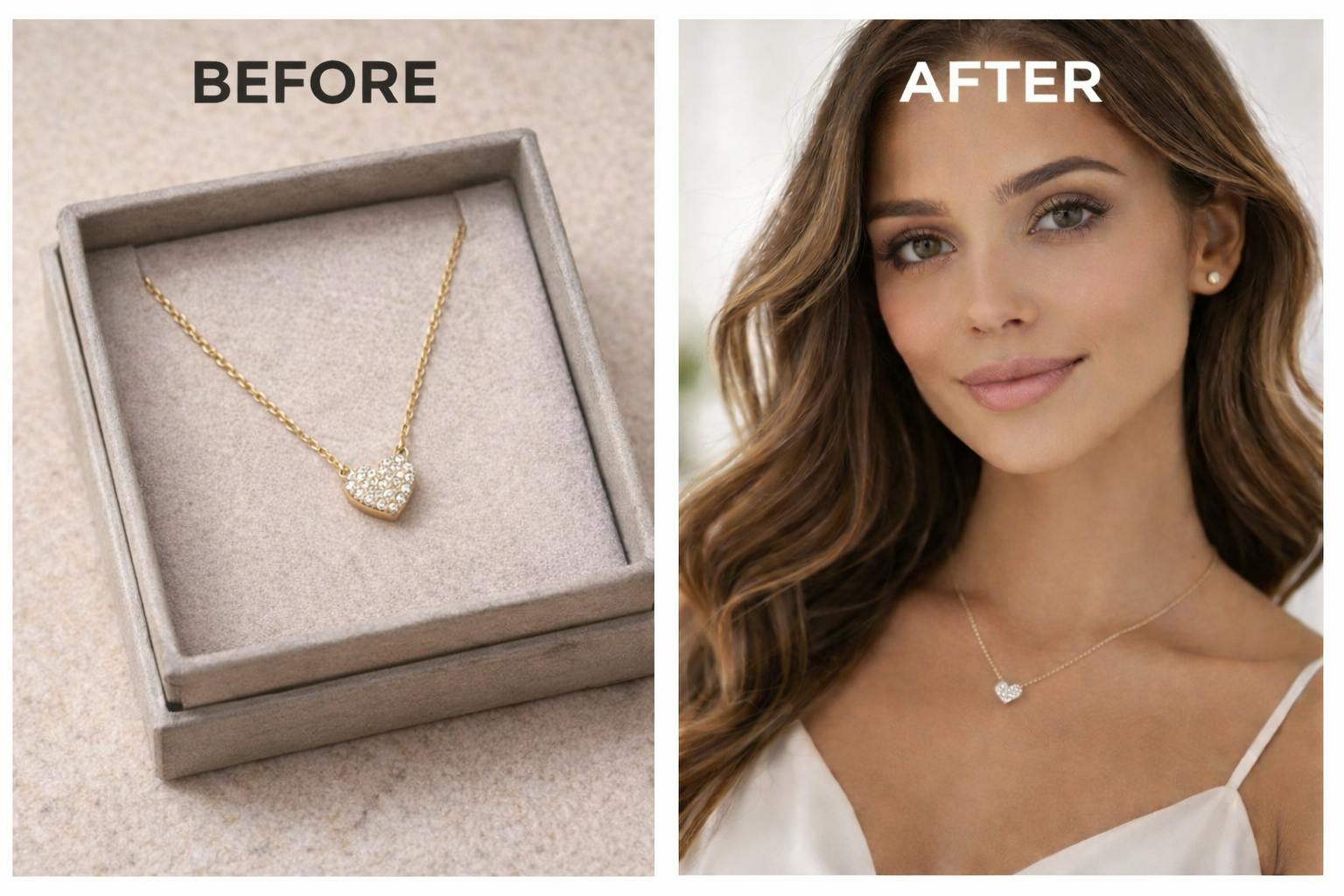When you showcase a necklace on a model, it helps customers see how it looks in real life. This instantly makes your product feel more desirable, relatable, and worth buying.